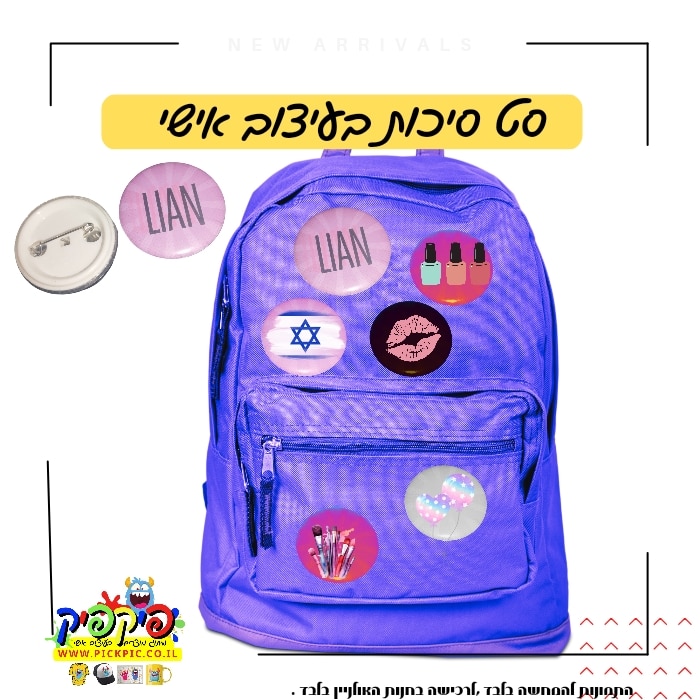 סיכות דש ממותגות לתיק עם שם ותמונה בעיצוב אישי